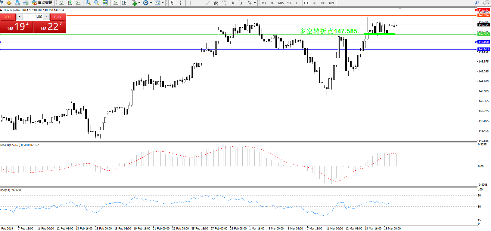 交易策略:147.585上方看涨,目标148.784149.127