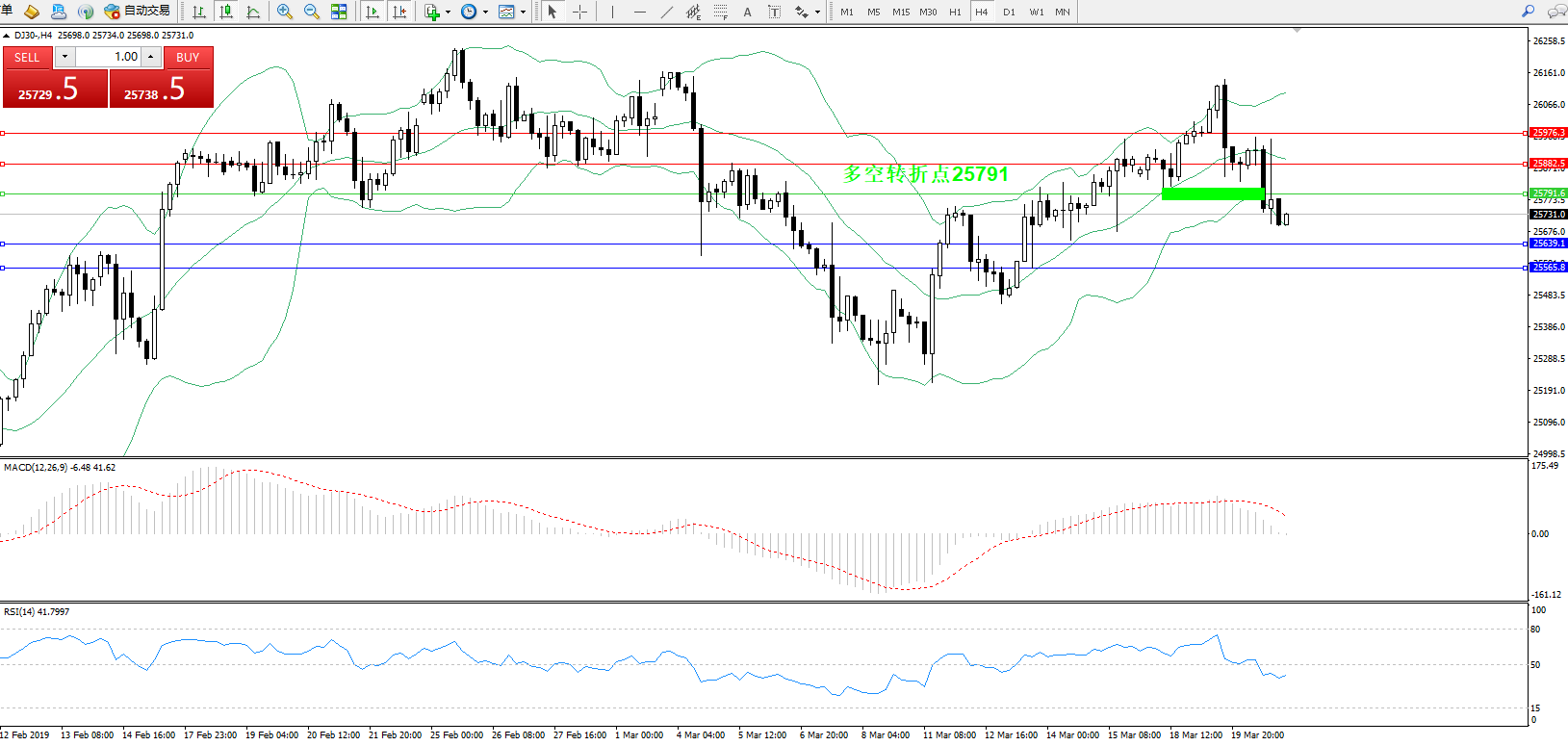 道琼斯指数DJ30—— 4小时K线图显示: