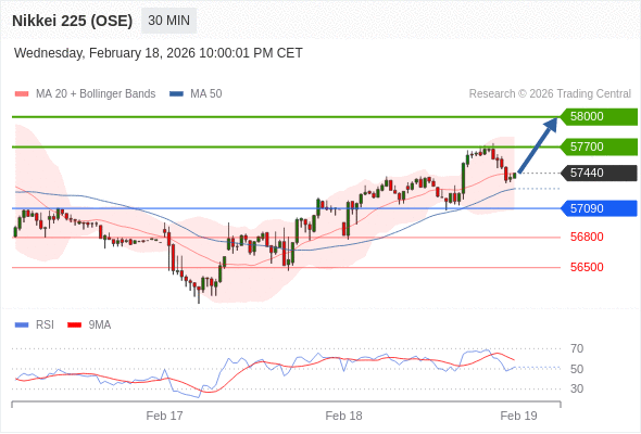 日经225股指期货 (OSE) 当日内: 在57090之上,看涨。