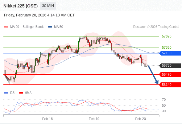 交易策略: 在 57150 之下,看跌,目标价位为 56470 ,然后为 56140 。