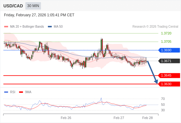 在 1.3690 之下,看跌,目标价位为 1.3645 ,然后为 1.3630 。