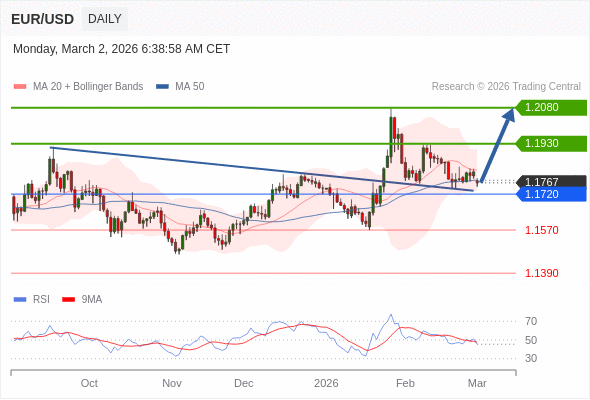 在 1.1720 之上,看涨,目标价位为 1.1930 ,然后为 1.2080 。