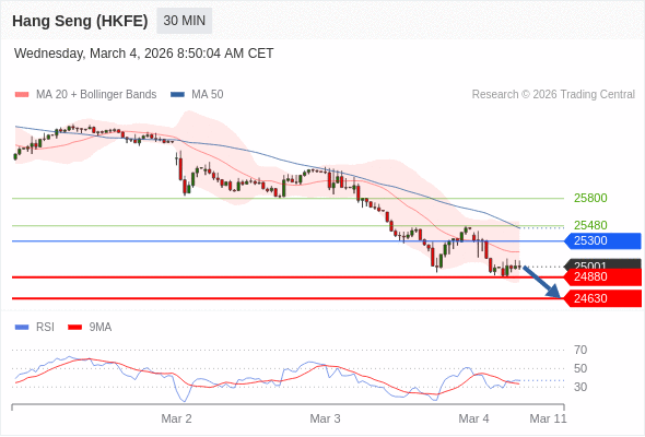 在 25300 之下,看跌,目标价位为 24880 ,然后为 24630 。