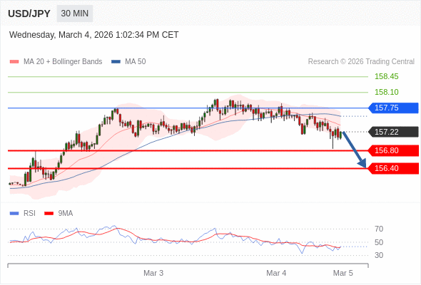 在 157.75 之下,看跌,目标价位为 157.10 ,然后为 156.40 。