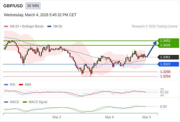 英镑/美元 当日内 : 看涨,当 1.3322 为支撑位,目标定在1.3452。