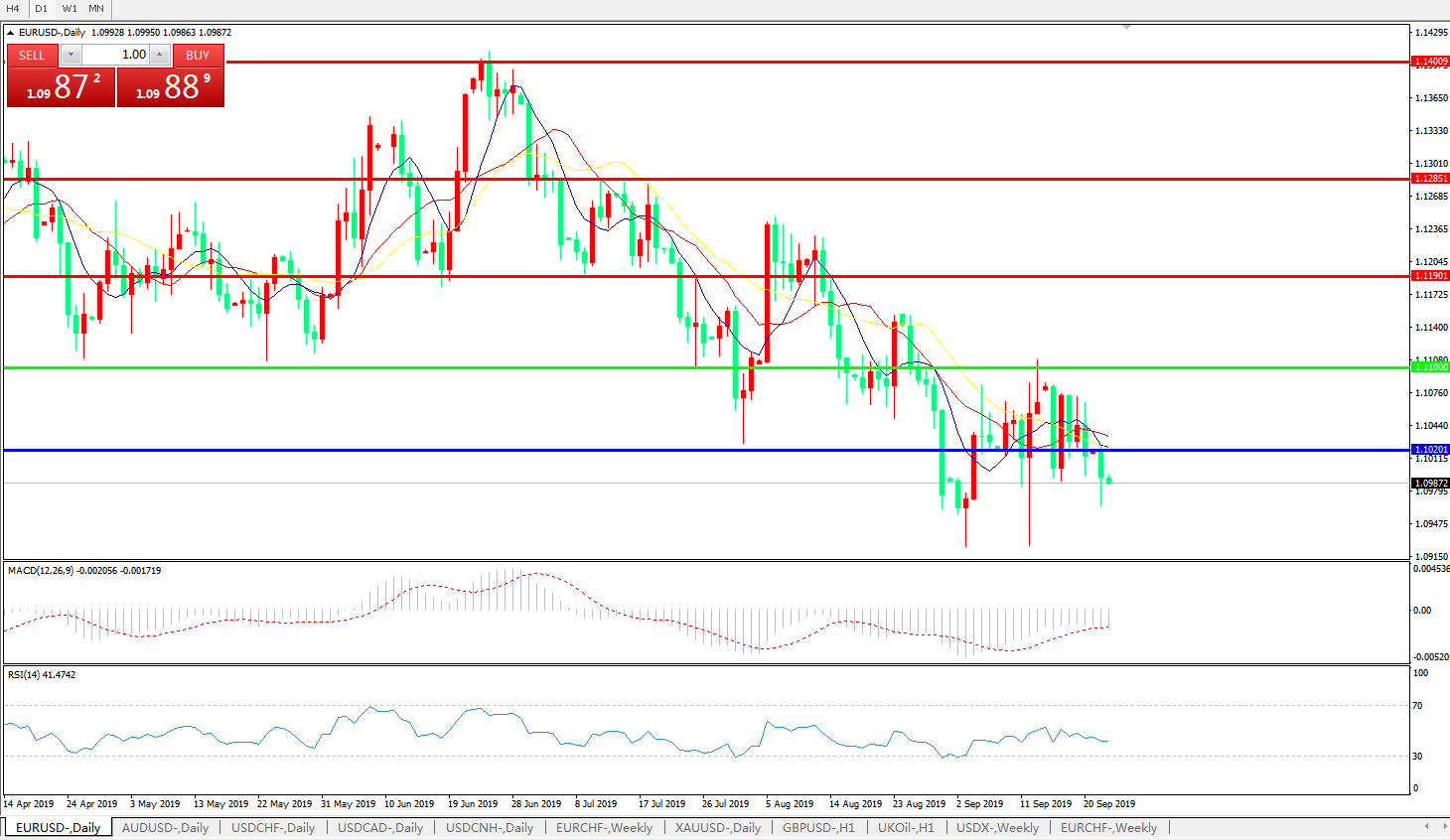 欧元兑美元在周一进入欧洲时段后开始跳跌,在法国9月PMI初值数据不及预期后跌触1.10关口,而此后,更加糟糕的德国PMI数据则对行情起到火上浇油的助推,令欧元兑美元汇价华丽失守上周以来的强力支撑位1.0985-90区间;德国9月制造业PMI触及41.4低位,远逊于各方预期并创下多年新低,原因是该国的支柱产业汽车制造业在全球需求结构改变和贸易压力的双重打压下陷入苦战,严重拖累了整体经济表现;虽然上周德国总理默克尔表示会通过向新能源汽车产业提供财政补贴来刺激经济活动,但是投资者对此反响并不积极; 这一提前宣判此后即将出炉的欧元区整体PMI会同样低迷,这将注定会倒逼欧洲央行在之后完成领导层交接之后继续扩大宽松力度,这对于欧元走势中期前景仍是利空。此后,前期1.0926处的双重底支撑可能会在短期内再度面临挑战。