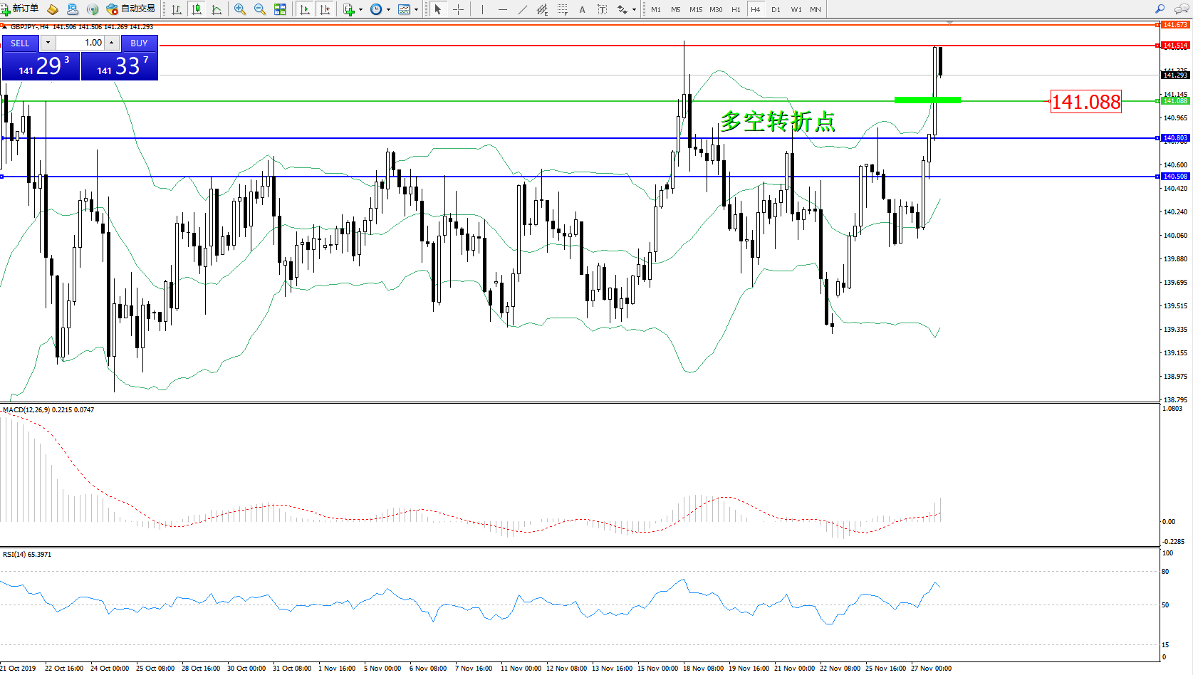 交易策略:141.088上方看涨,目标141.514、141.673