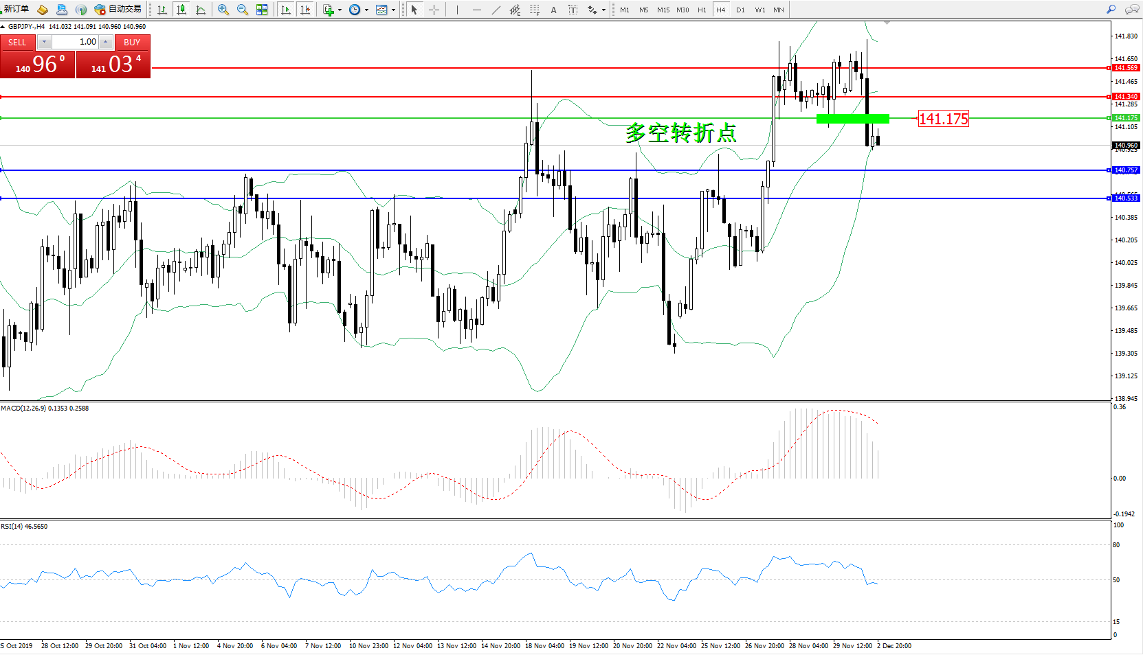 备选策略:141.175上方看涨,目标141.340、141.569