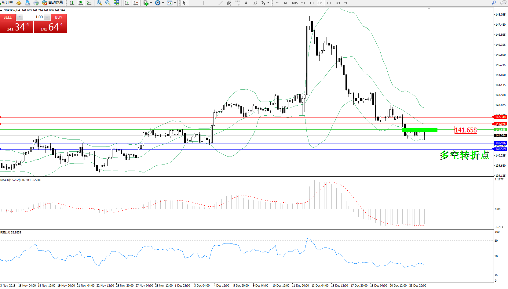 交易策略:141.658下方看跌,目标140.916、140.579