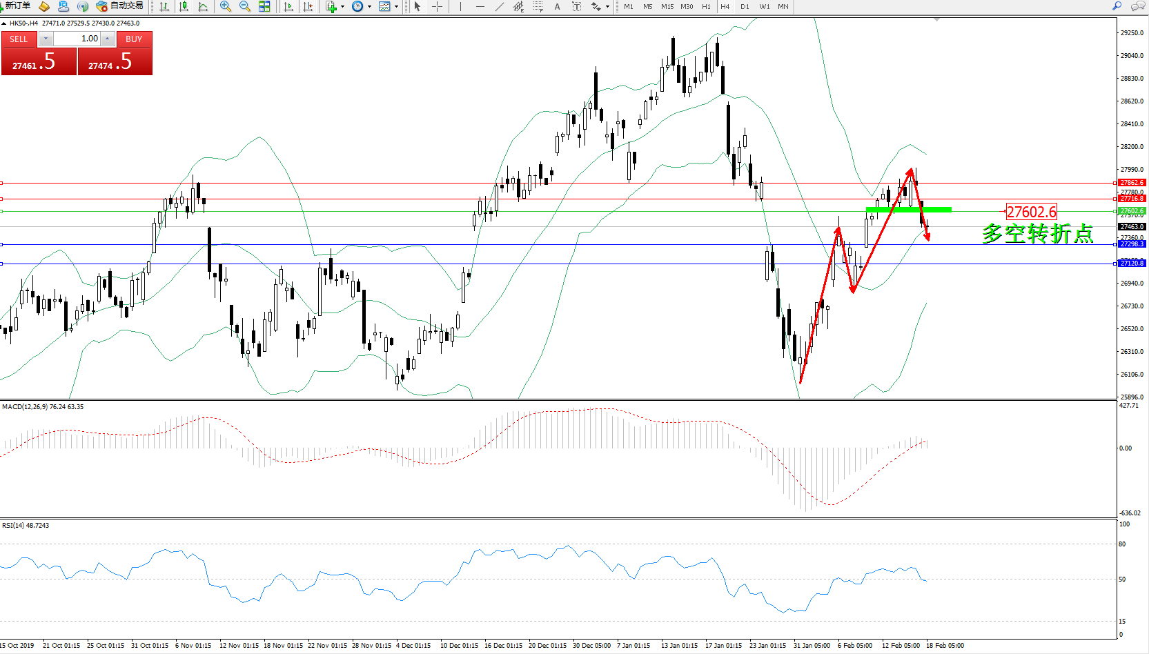 恒指HK50 ——4小时K线图显示: