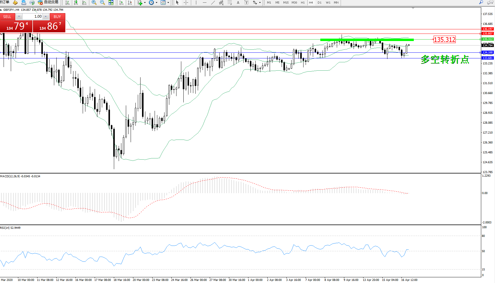 交易策略:135.312下方看跌,目标134.168、133.681