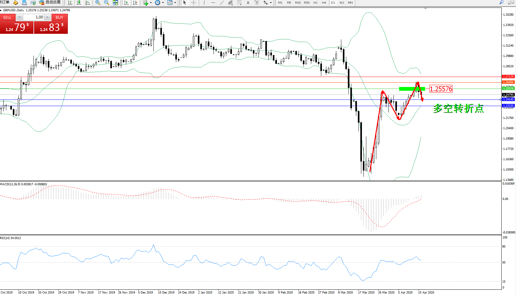交易策略:1.25576下方看跌,目标1.24145、1.23335