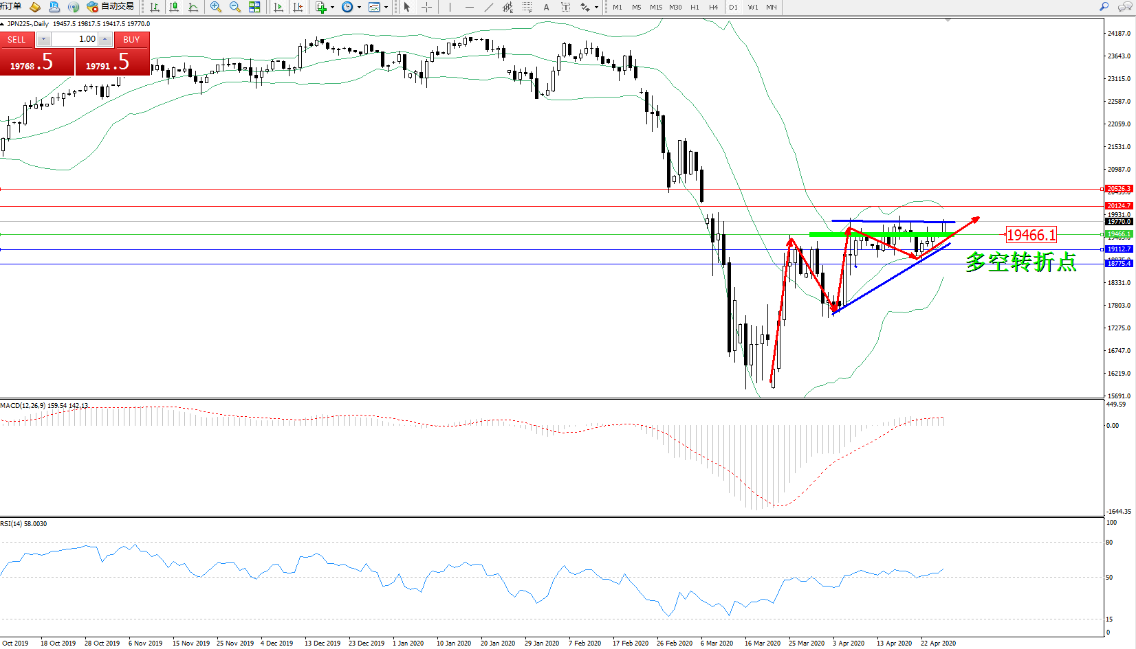 日经225指数427日(周一)收盘上涨481.50点,涨幅2.50%,报19743.50点。日本央行周一发布政策决议,维持各项政策决议不变,只是口头承诺将增加公司债的购买力度。这令投资者感到失望。由于日本周三起将进入黄金周假期,因此本周的会议提前举行,并且会期也因为冠状病毒疫情被压缩到一天,但投资者并未从中解读出太多的亮点;市场将目光投向了本周稍后出炉的美联储政策决议,对美联储继续口头强化宽松的预期,连同在周末过后市场风险情绪回温的背景一同,都令美元指数重新承压。