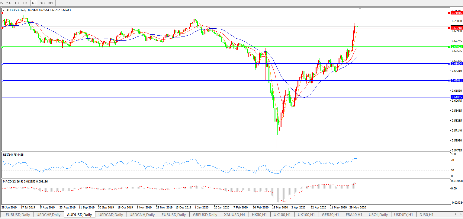 技术面简析:日图均线呈有序多头排列,汇价冲击0.6920附近横盘整理,MACD运行于0轴上方且量能快速放量,RSI开始走平,预计汇价大概率将在整理蓄势后进一步上行。