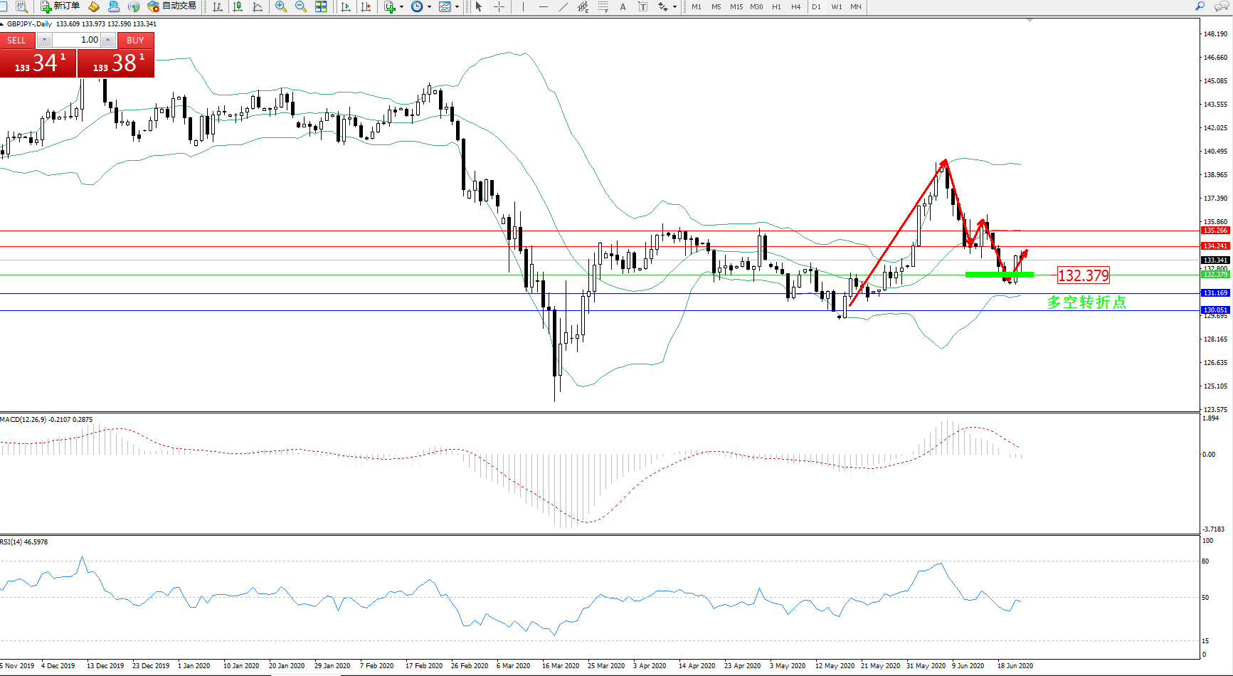 交易策略:132.379上方看涨,目标134.241135.266
