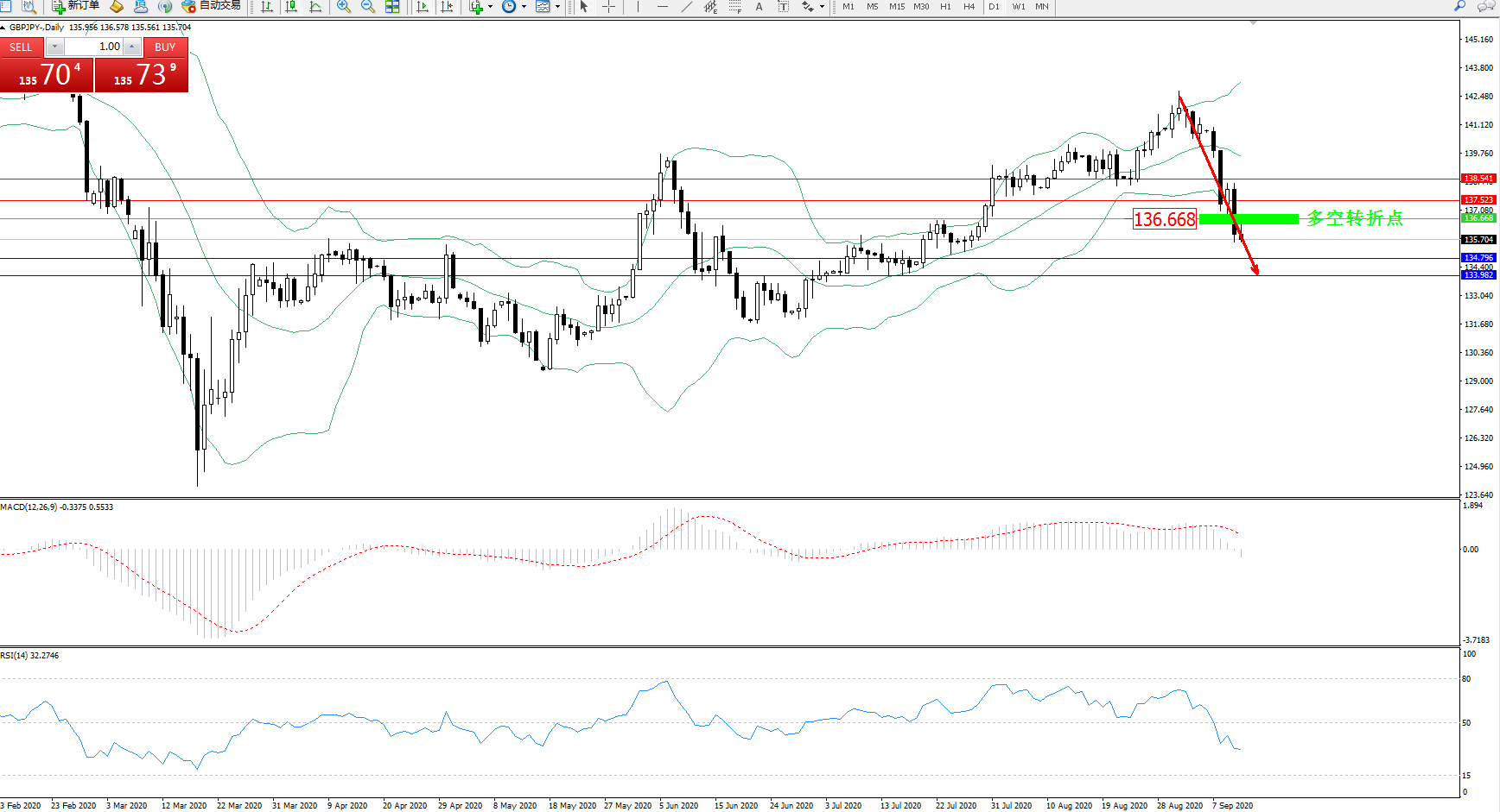 交易策略:136.668下方看跌,目标134.796、133.982