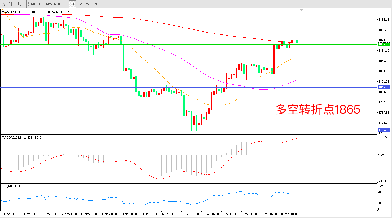 4小时图看,金价低位大幅拉升,短期走势表现强势1865被成功突破200周期均线如能站稳金价有望掀起新一轮的大涨短期均线拐头向上MACD红柱增加,RSI指标走平,日内震荡上行概率较大。