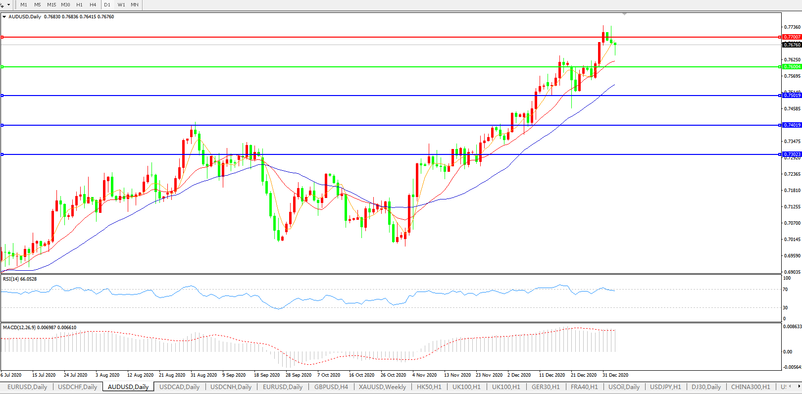 2021全球经济乐观,澳元兑美元回落整理