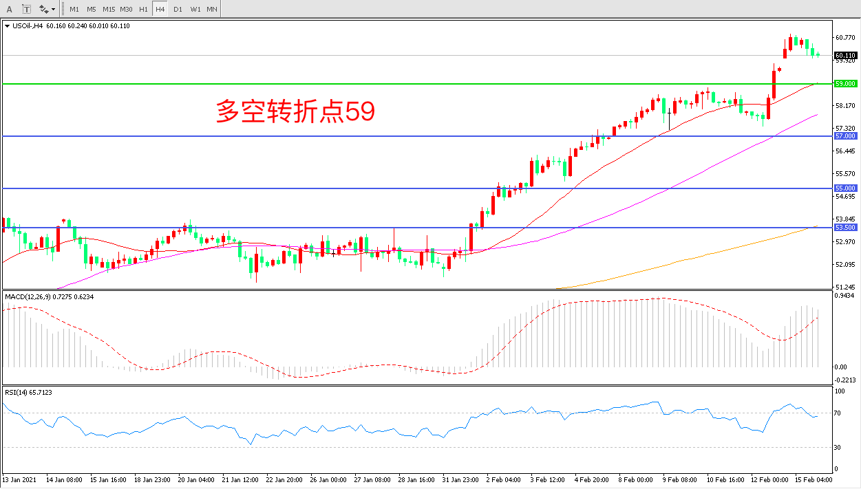 4小时图看,油价连续上涨后高开高走,上行趋势十分明显60美元被强势突破行情进入加速上行阶段MACD红柱增加RSI指标向上,日内延续上行概率较大。