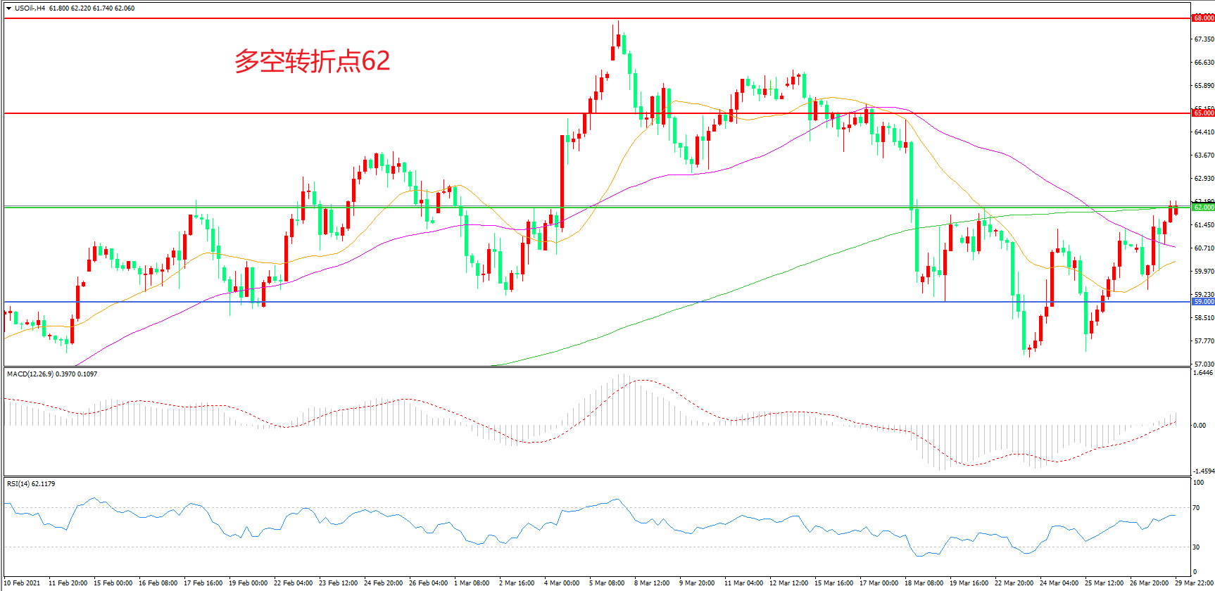 4小时图看,油价回踩21周期均线后再度拉升,整体表现有所回暖,62美元成为多空分水岭,55周期均线形成下方支撑,MACD红柱增加,RSI指标向上,日内震荡上行概率较大。