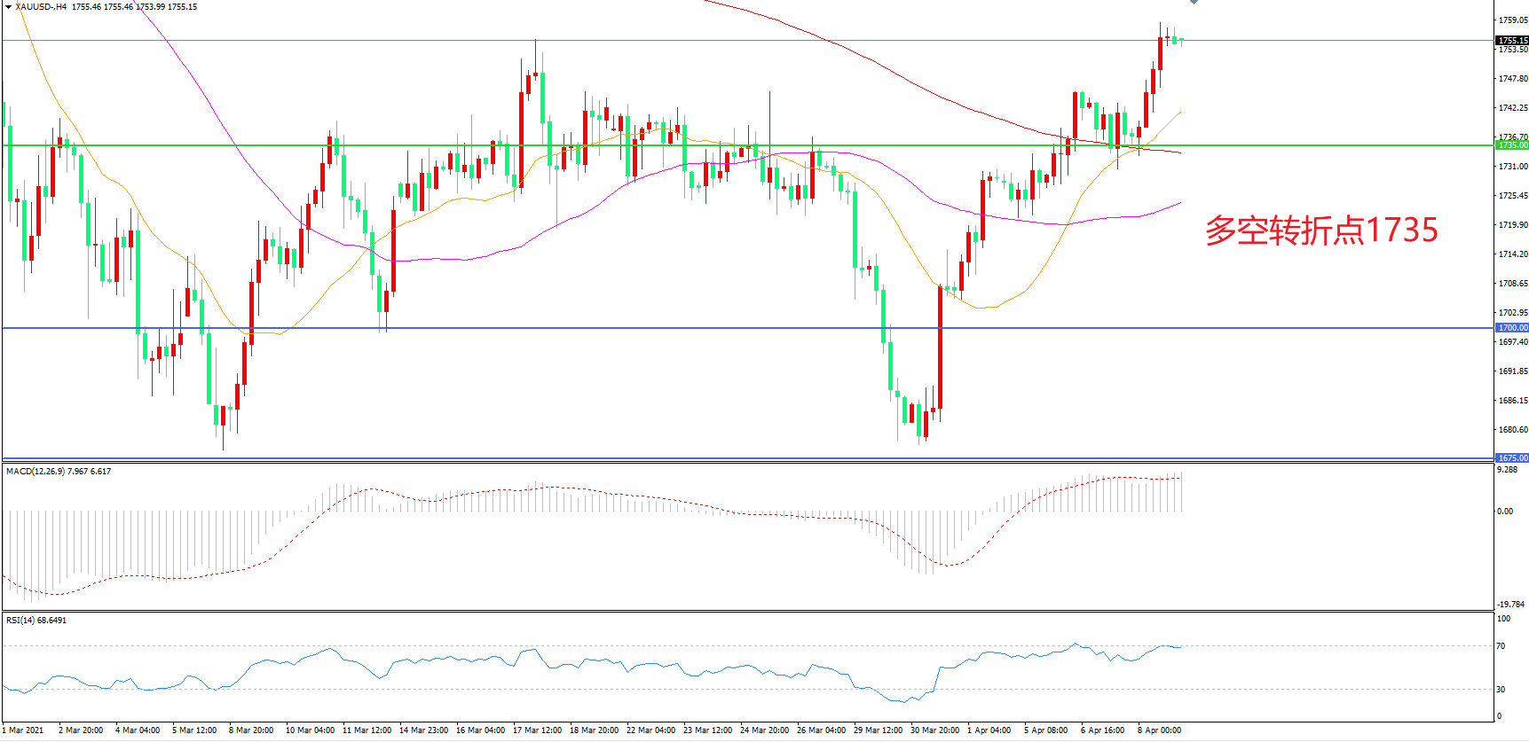 周四(4月8日),虽然上周美国首次申请失业救济人数意外不降反增,但美联储再次释放宽松信号,美联储主席鲍威尔称,全球新冠疫苗接种发展不均威胁到经济复苏,通胀料将暂时上行,美债收益率回落、美元跌至逾两周最低提振金价表现,现货黄金大幅拉升,收报1754.67美元/盎司。