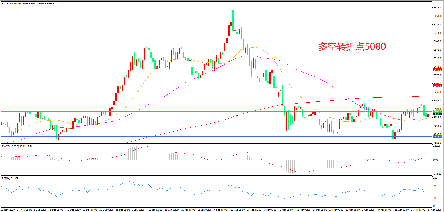 4小时图看,沪深300长阴下破后延续低位震荡,短期走势方向并不明朗,均线系统粘合形成下方支撑,200周期均线成为上方阻力,MACD红柱增加,RSI指标走平,日内震荡上行概率较大。