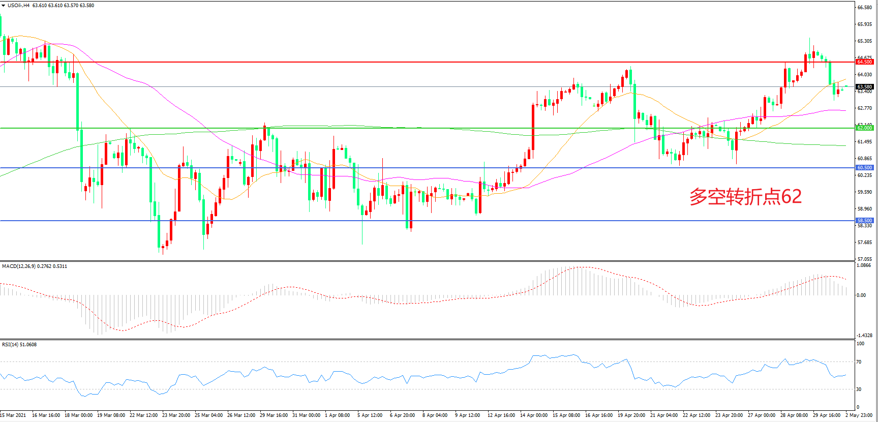 上周五(4月30日),因市场对印度和巴西为遏制新冠疫情而扩大封锁的担忧,暂时盖过了投资者对夏季燃料需求和经济复苏的乐观前景,美国WTI原油震荡回落,收报63.45美元/桶。目前,美国几个城市正从封锁中复苏,在关键的美国夏季驾驶季节到来之前,增加了汽油需求强劲的信心,此外即将到来的五一假期也将提振中国这个全球第二大石油消费国的燃料需求。