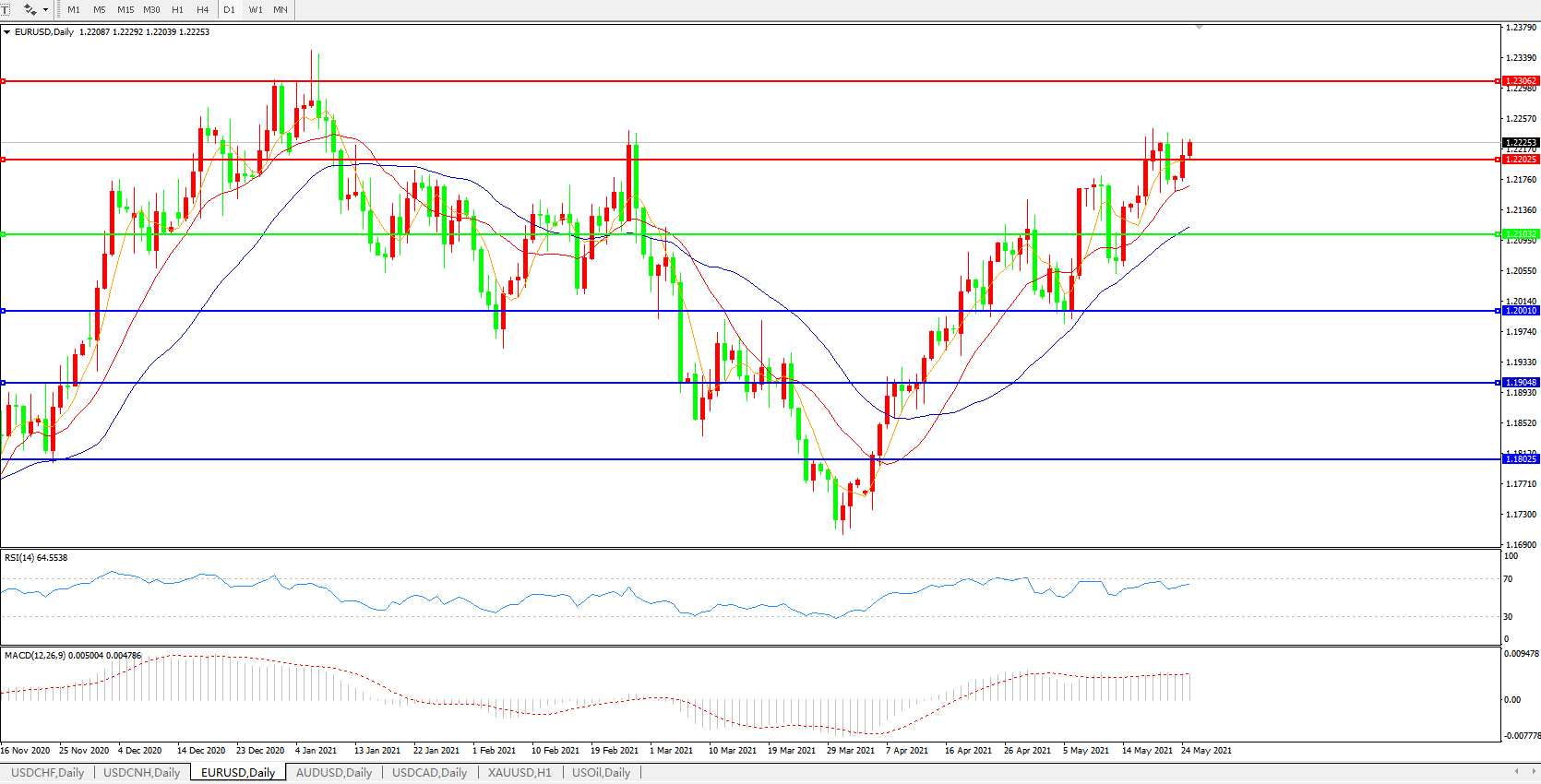 技术面简析:日图均线呈上行态势,汇价整理多日后开始攀升,MACD运行于0轴上但量能开始微缩量,RSI缓步走升,预计短期汇价大概率将进一步上行。