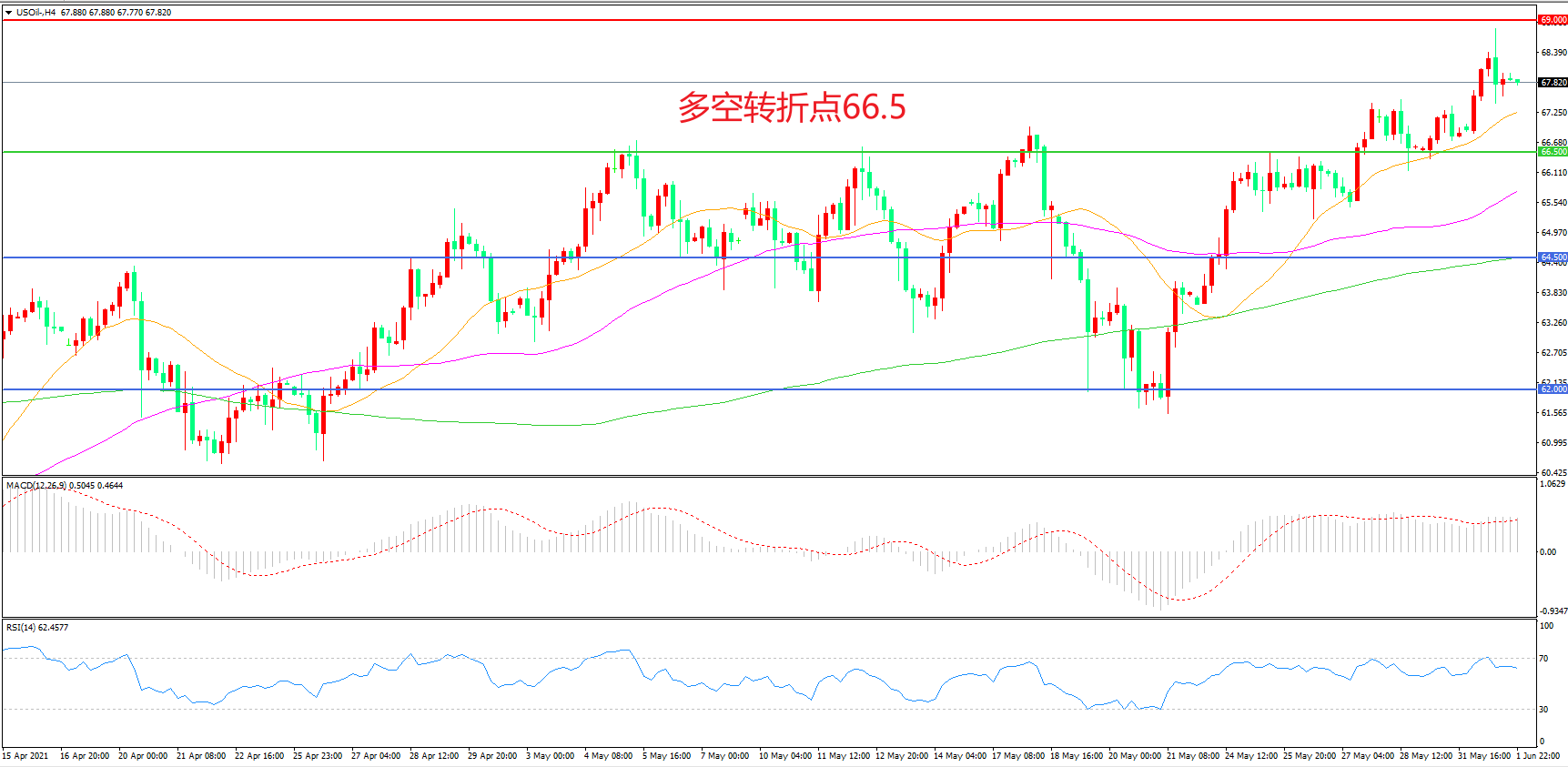 交易策略:在66.50之上看涨,目标69.00 72.00