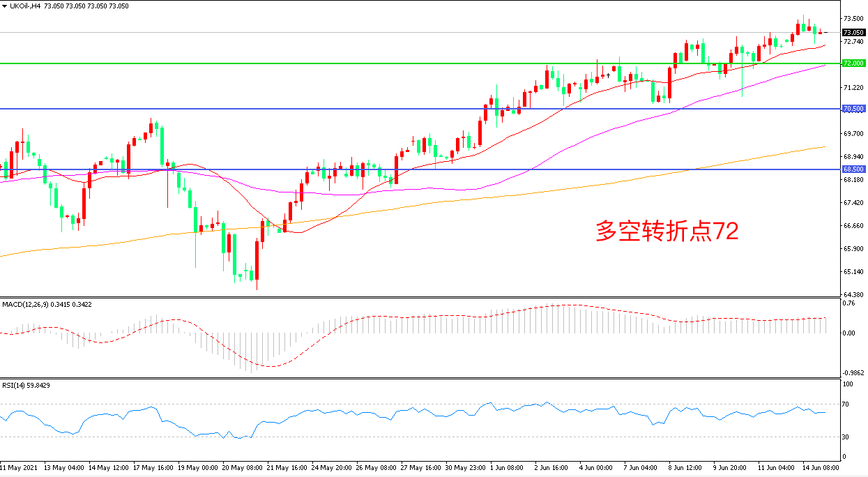 周一(6月14日),欧美经济刺激力度不减,市场对原油市场供需展望乐观,布伦特原油一度快速冲高,但在伊朗宣布与美国就解除能源制裁达成广泛协议后,布伦特原油回吐部分涨幅,收报73.05美元/盎司。随着疫情重新得到控制,新冠疫苗接种率上升,全球经济增长,原油需求进一步恢复是大势所趋,三季度油价大概率维持高位运行。