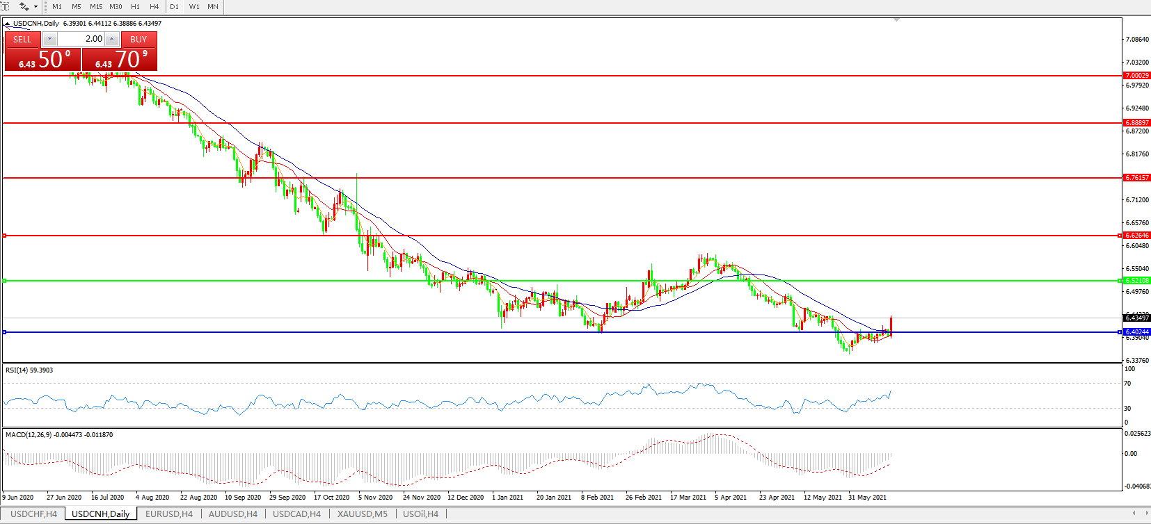 备选策略: 在6.5200之上,看涨,目标价位为6.6270,然后为6.7615。