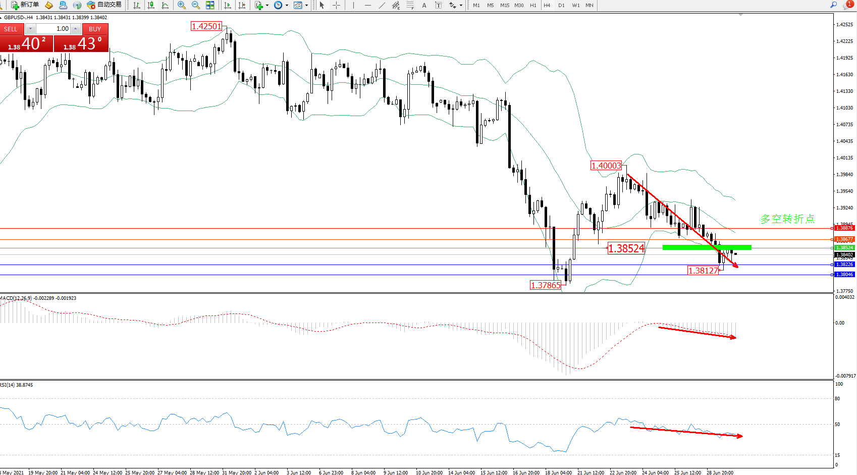 交易策略:1.38524下方看跌,目标1.38226、1.38046