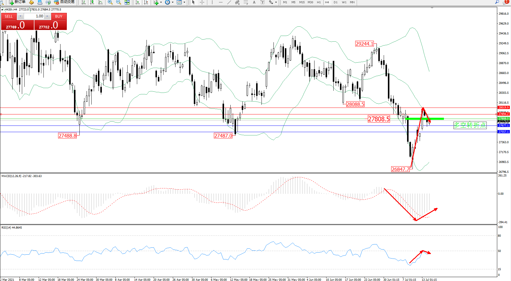 恒指HK50 ——4小时K线图显示: