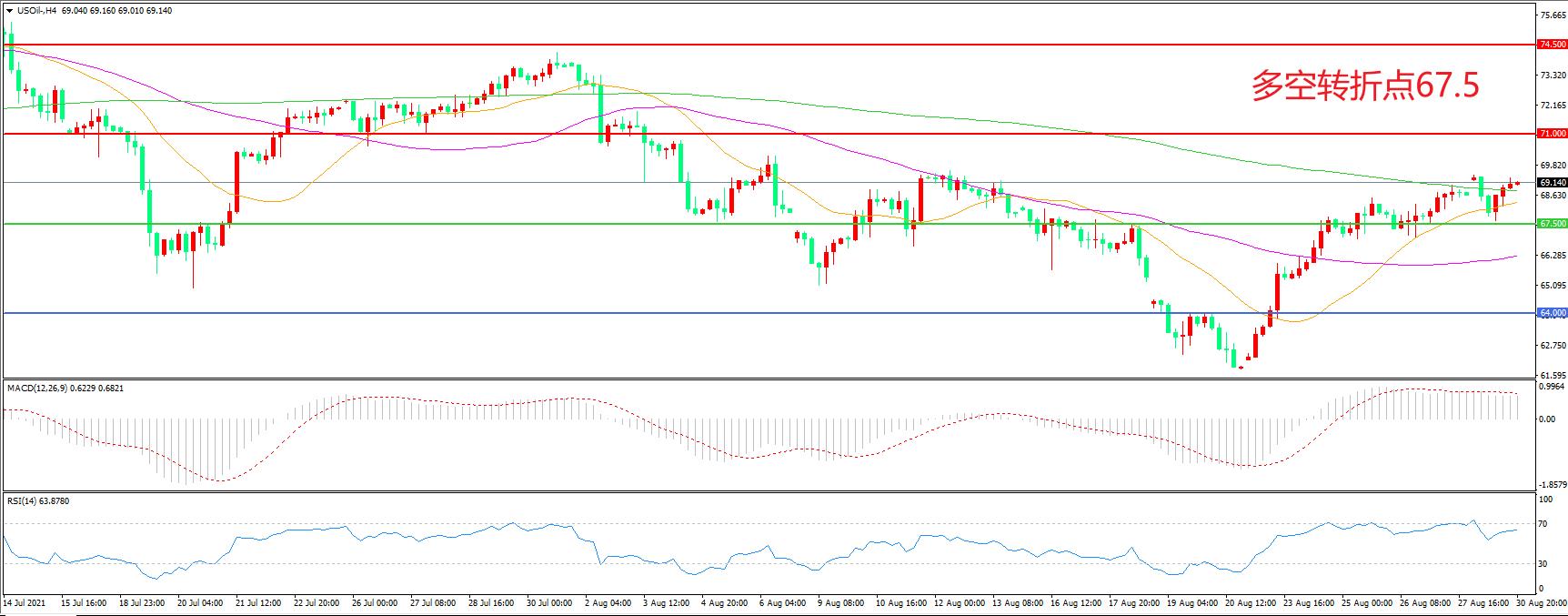 交易策略:在67.50之上看涨,目标71.00                74.50