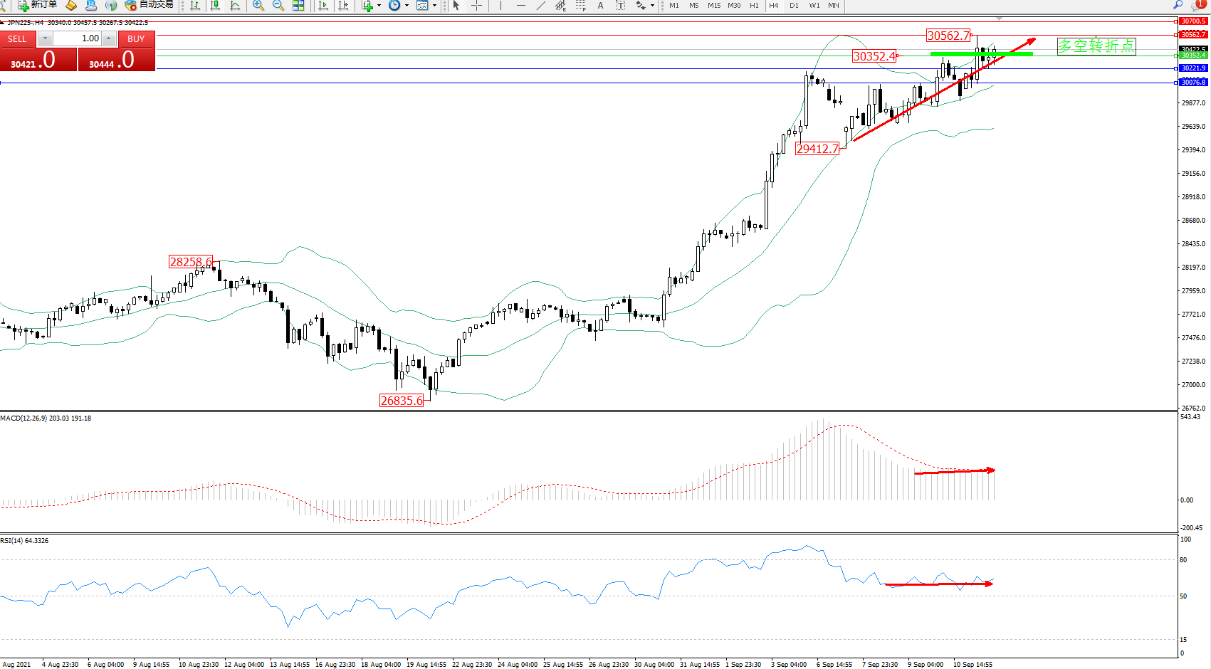 技术点评:多头动力长时间维持在布林带指标通道中上轨区间持续震荡向上移动,高位抵达30562位置节点后短暂整理,多头动力有继续向上拉升态势,布林带指标呈收口走势后开始缓慢再度张口,MACD指标处于多头区域长时间维持整理平移,RSI指标多头区域持续整理徘徊;