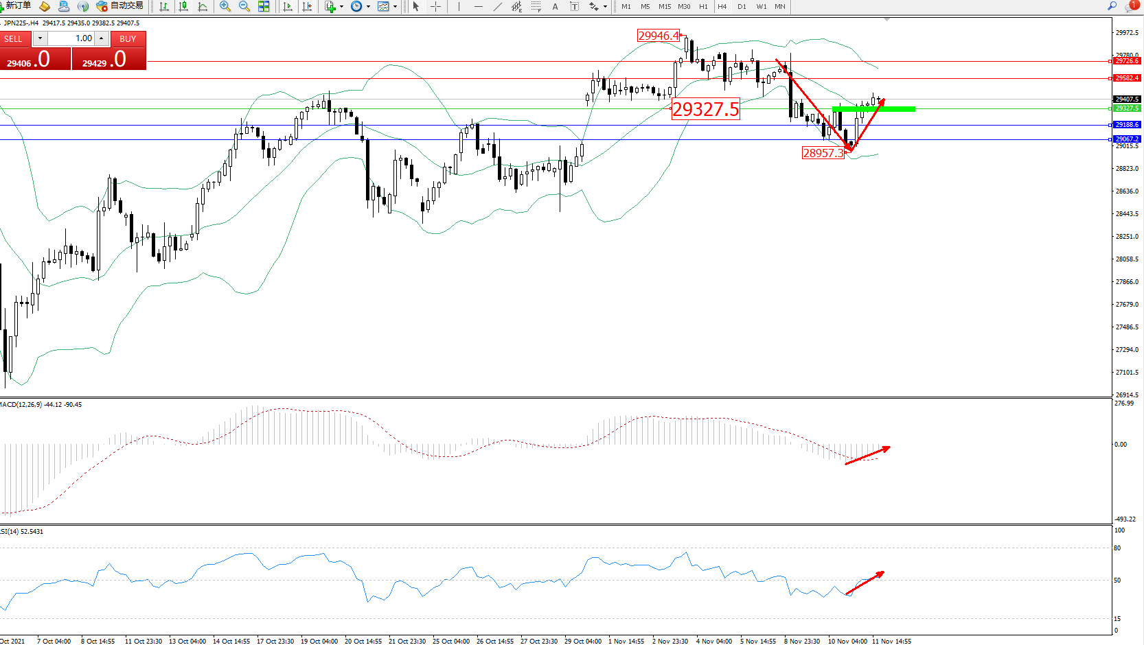 技术点评:空头动力延续布林带指标通道中下轨区间持续震荡下行,低位抵达28957位置得到支撑后反转强势拉升,纠结于布林带指标中轨上方弱势整理中,多头动力有进一步上移迹象,布林带指标收口走势良好,MACD指标低位多头动力维持整理缓慢上移至0轴线附近徘徊,RSI指标维持窄幅整理上移至50均衡线上侧徘徊中;