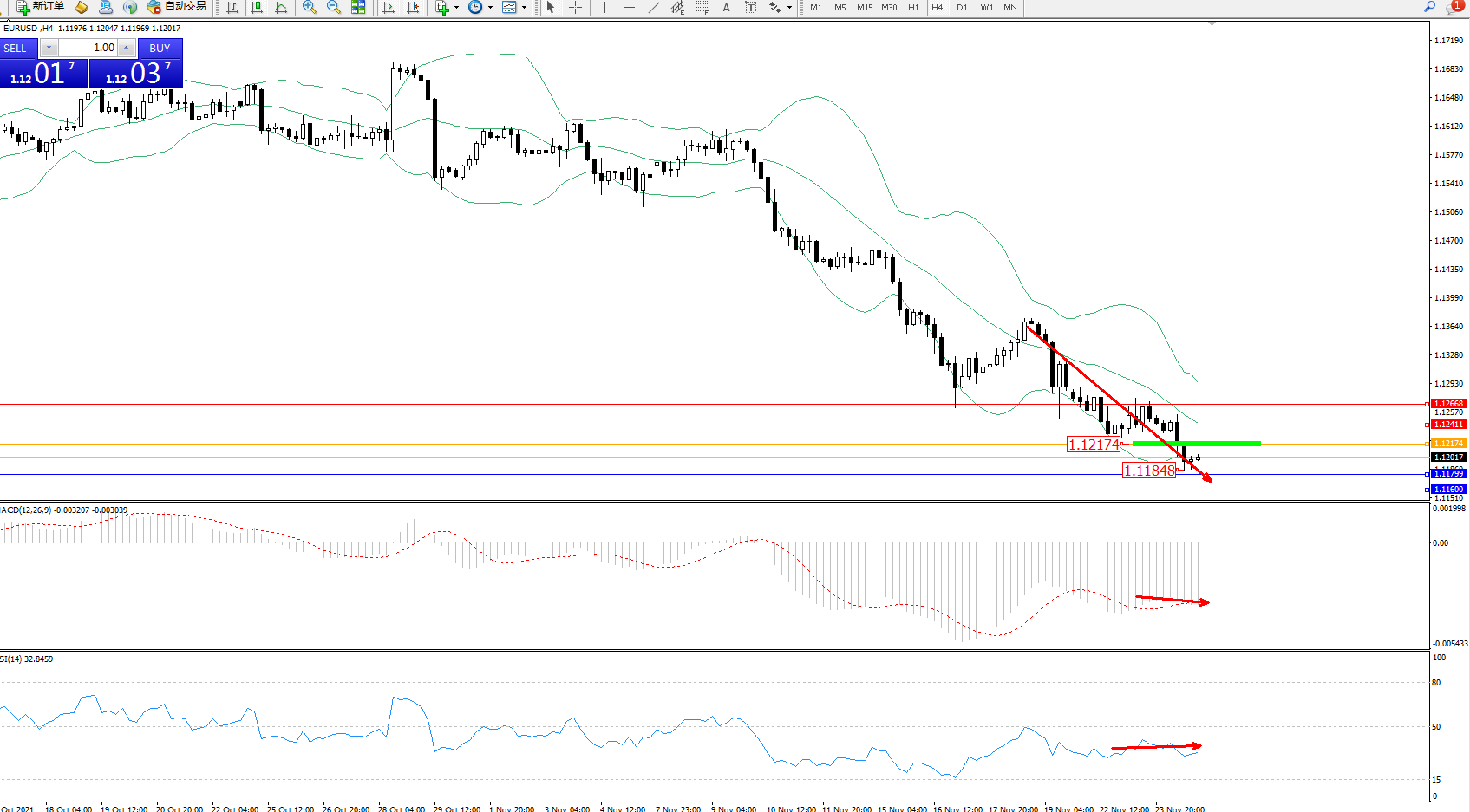 交易策略:1.12174下方看跌,目标1.11799、1.11600