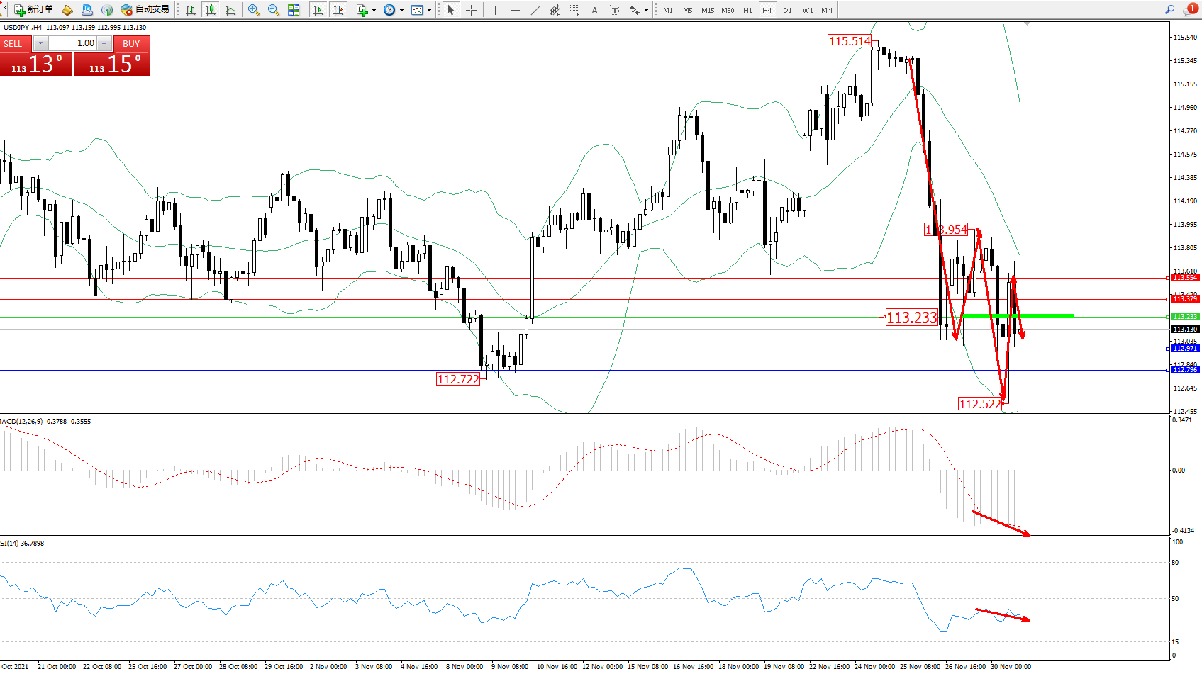 交易策略:113.233下方看跌,目标112.971、112.796