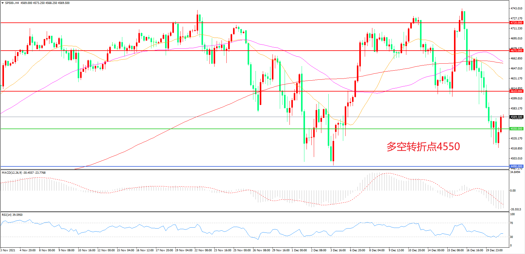 4小时图看,标普500自高位长阴回落,短线走势低迷,4610一线被跌破,4550成为多空分水岭,MACD绿柱增加,日内震荡下行概率较大。
