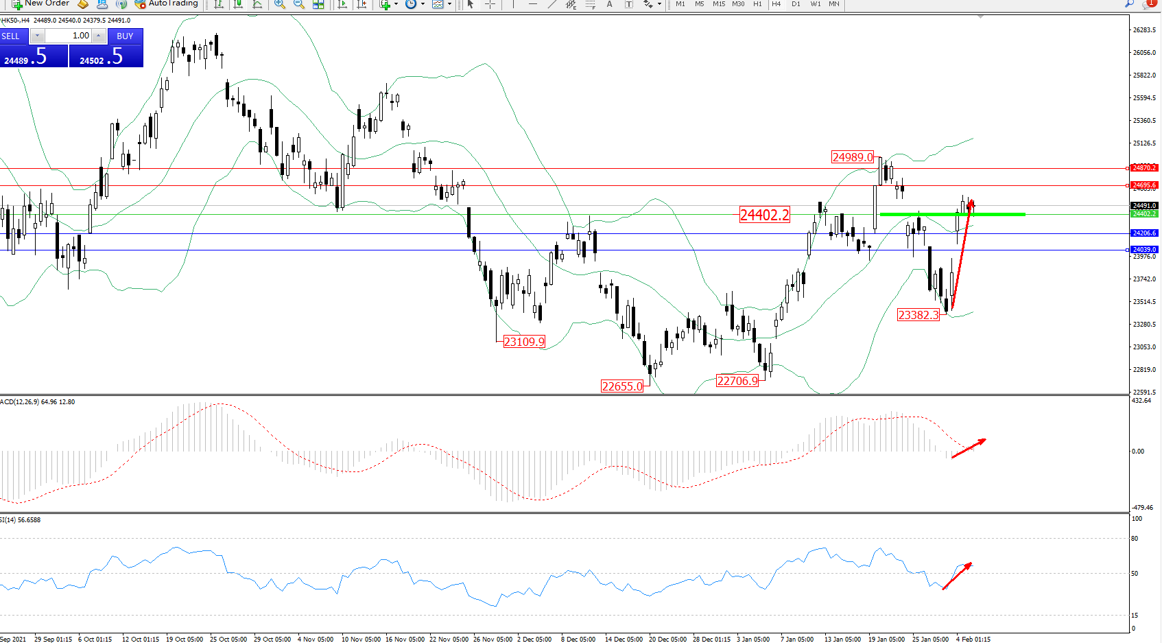 恒指HK50 ——4小时K线图显示: