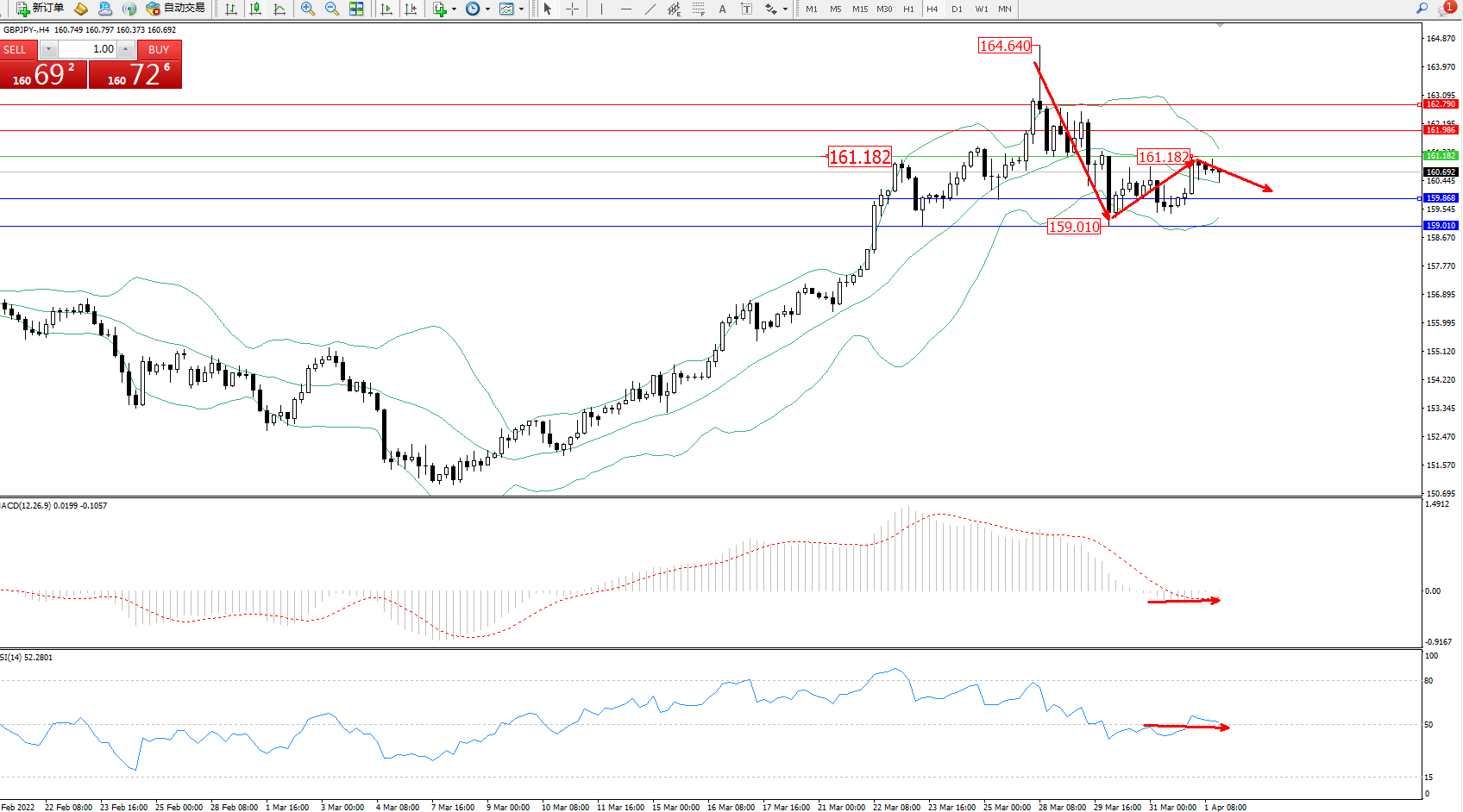 交易策略:161.182下方看跌,目标159.868、159.010