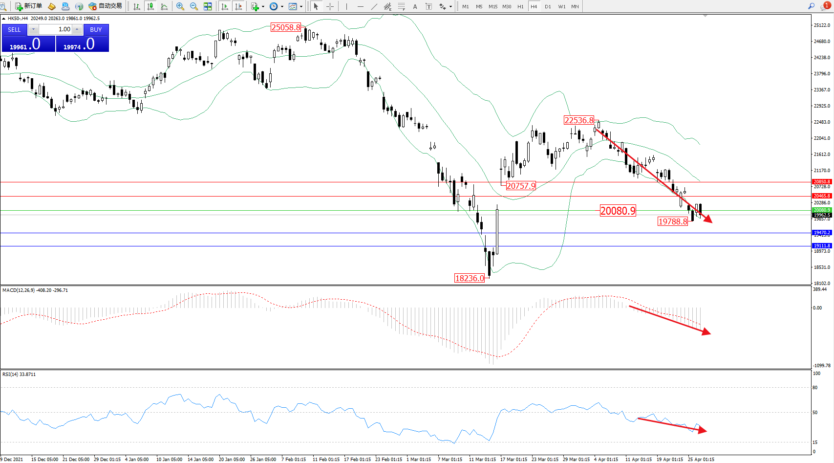 恒指HK50 ——4小时K线图显示: