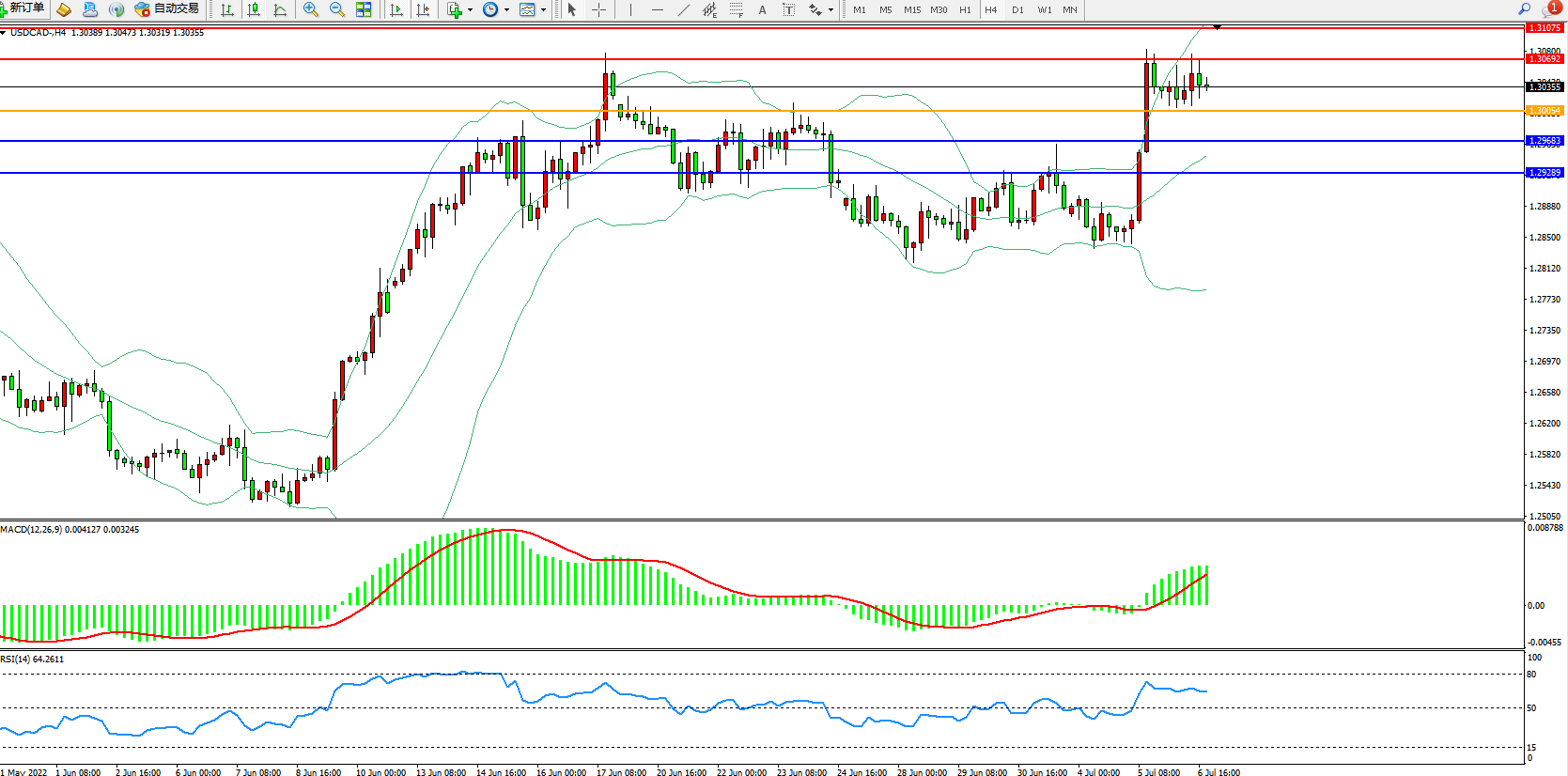 美元加元USDCAD——4小时K线图显示: