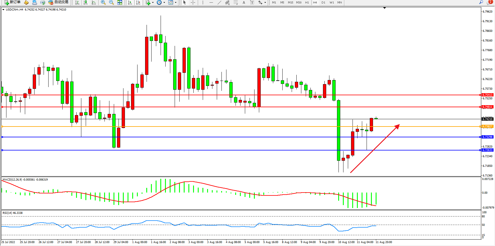 美元人民币USDCNH——4小时K线图显示:
