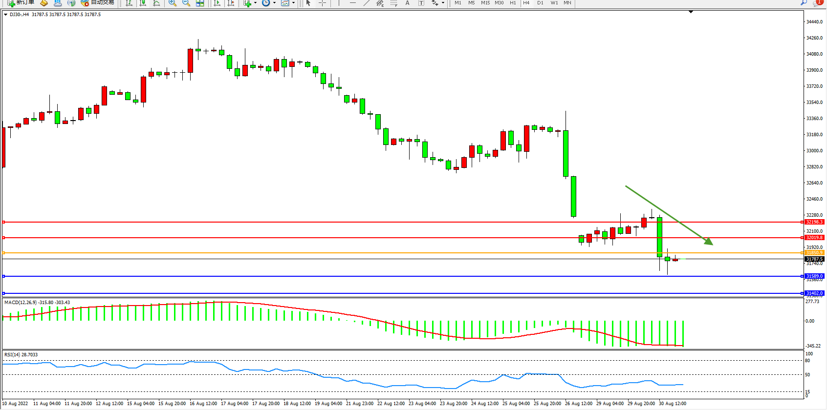 道琼斯指数DJ30——4小时K线图显示: