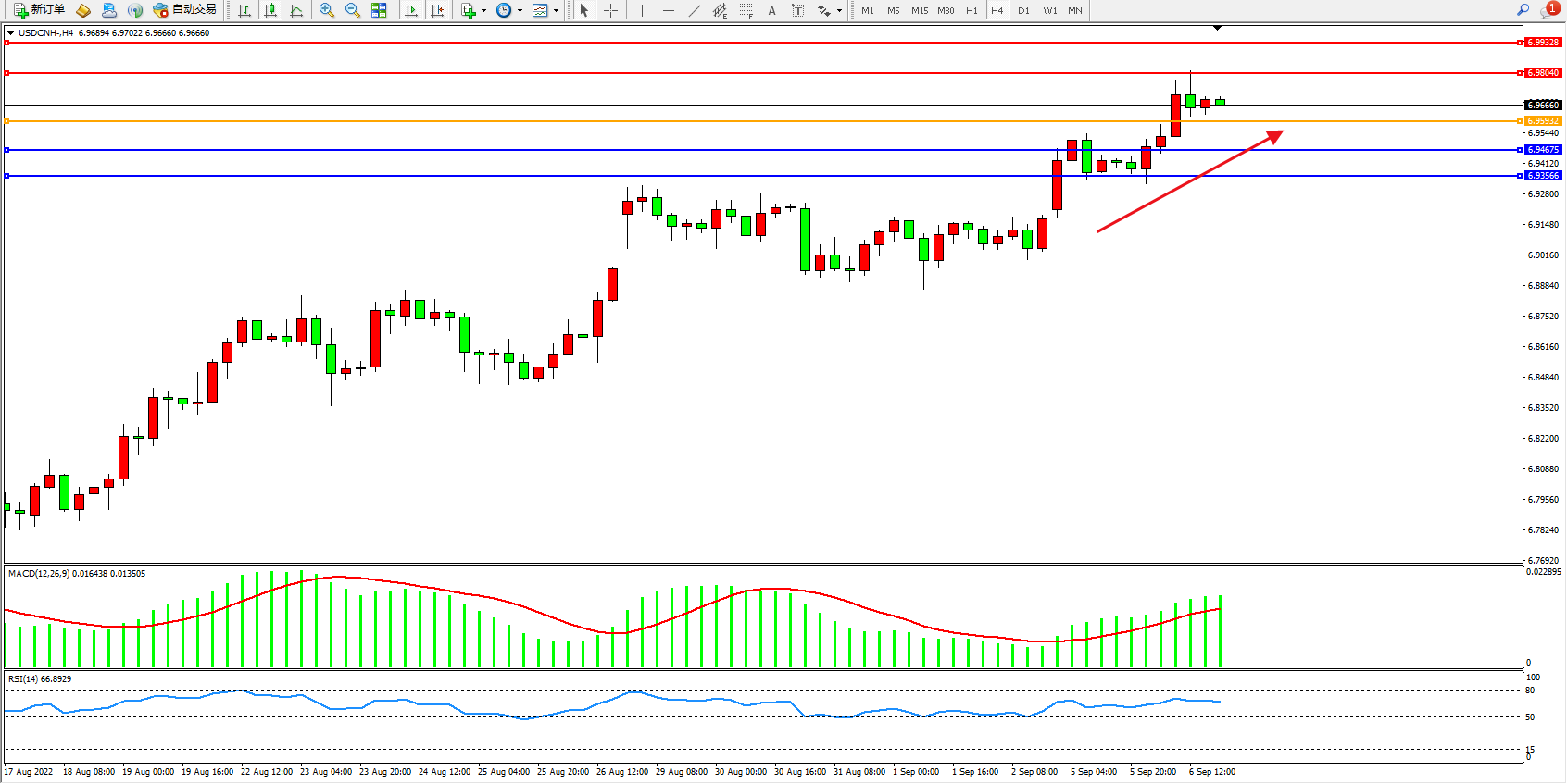 备选策略:6.95932上方看涨,目标6.98040、6.99328