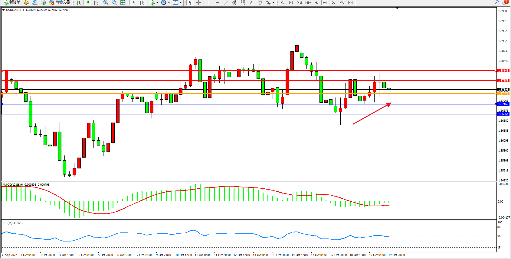 美元加元USDCAD——4小时K线图显示: