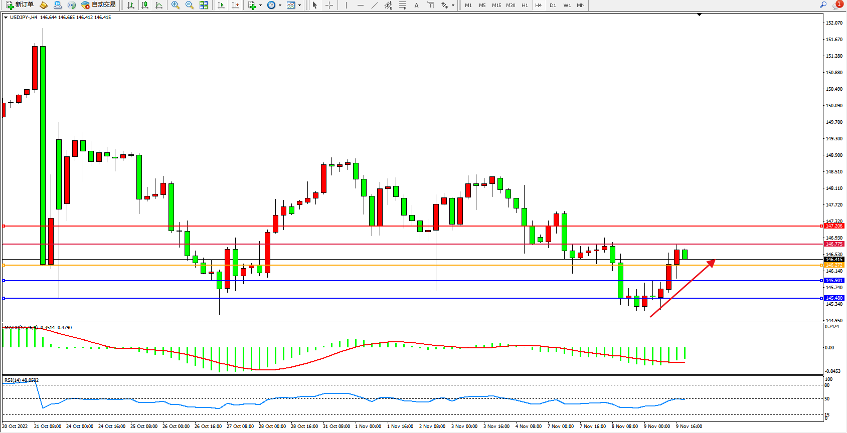 4小时图看:低位窄幅震荡缓慢上行,短期多头动力开始伺机入场缓慢拉升,市场多头情绪开始涌现,MACD指标处于空头区域整理上移,RSI指标处于50均衡线下侧弱势徘徊;
