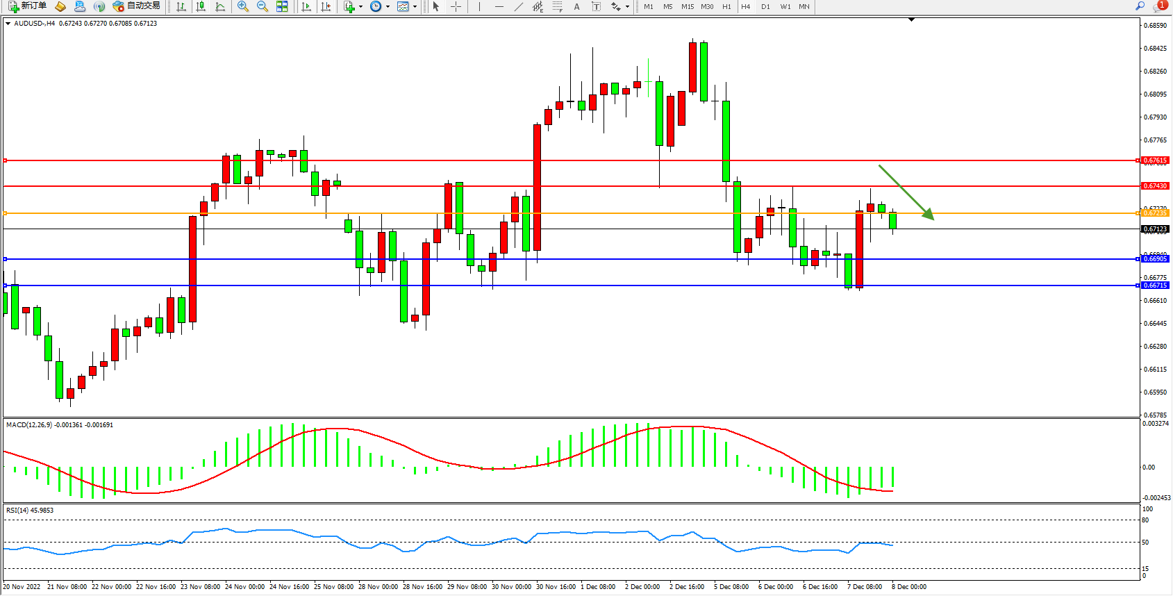 备选策略:0.67235上方看涨,目标0.67430、0.67615