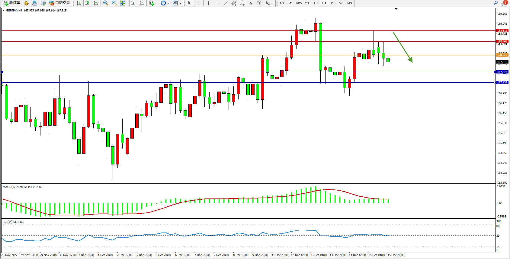 交易策略:168.023下方看跌,目标167.478、167.138